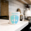 Baby name mug personalised with any name of your choice, and choose Blue or Pink Feet. Ideal gift for Christening, Birth, New Baby or Gender Reveals.