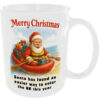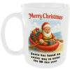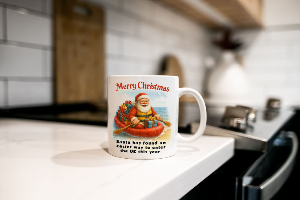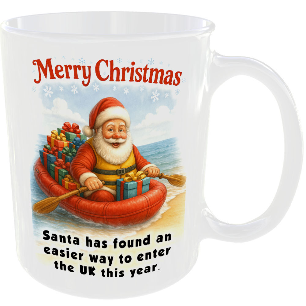 Bring laughter to every sip with this Funny Santa In a Dingy Mug! Featuring Santa entering the UK via the english channel and the hilarious quote: โSanta has found an easier way to enter the UK this year.โ A great gift for friends, coworkers, or anyone who loves dark humour funny mugs.
