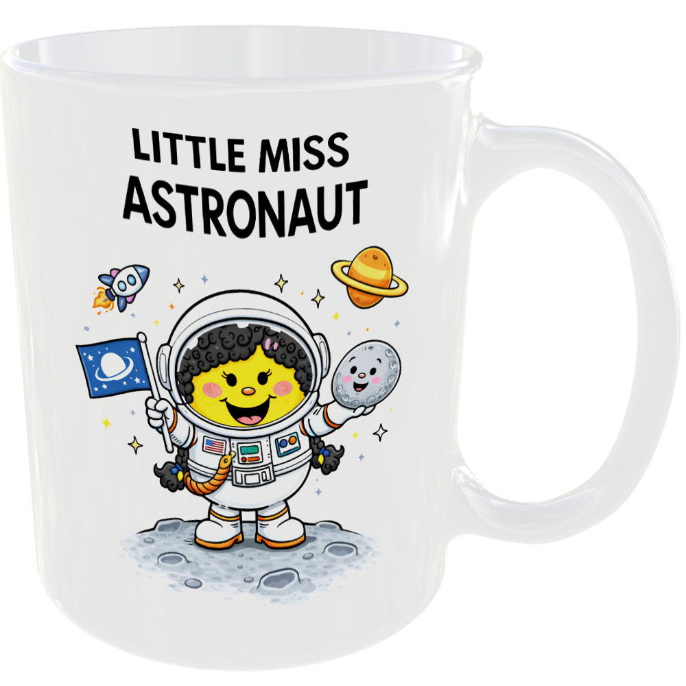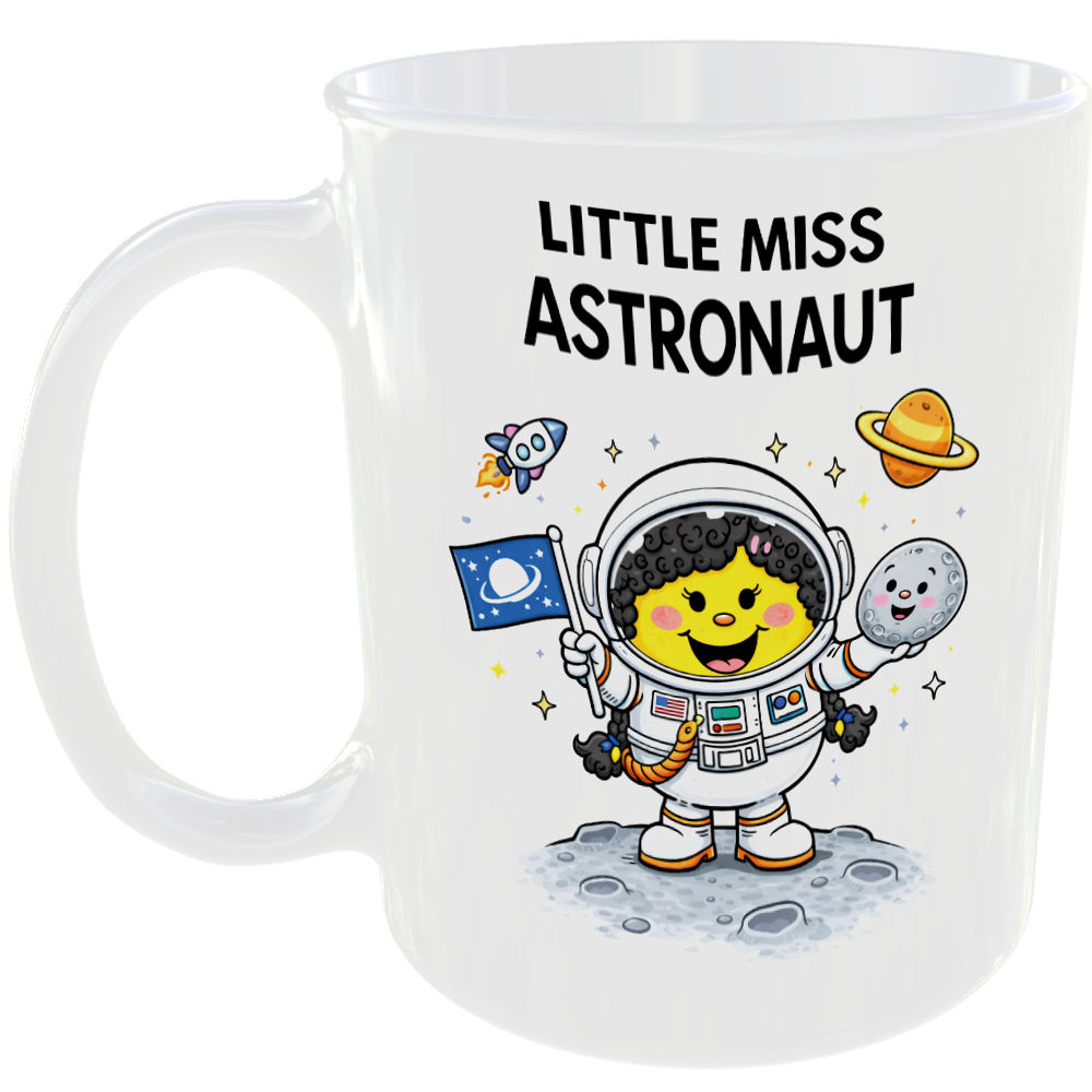 Playful Little Miss design featuring ‘Little Miss Astronaut’, with clean flat cartoon artwork and bold rounded text.