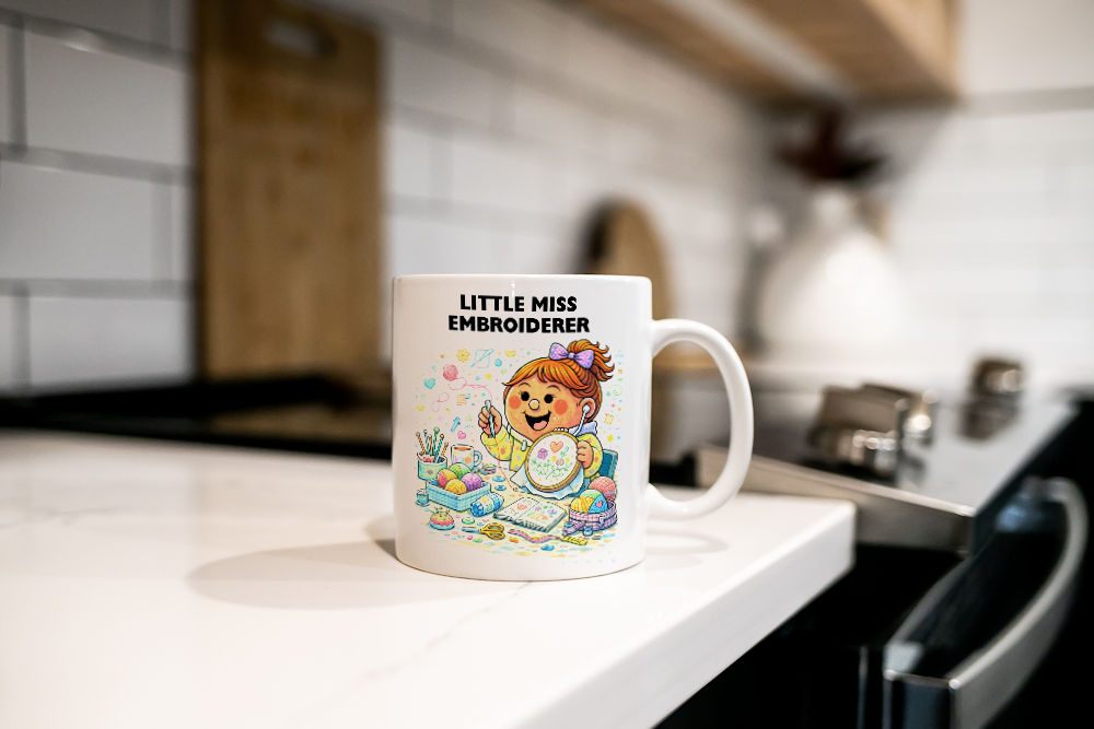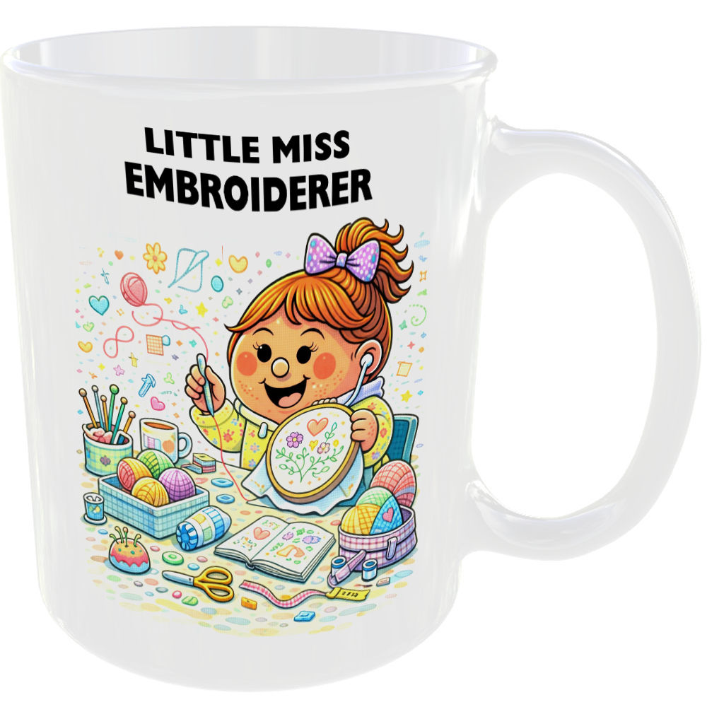 Playful Little Miss design featuring ‘Little Miss Embroiderer’, with clean flat cartoon artwork and bold rounded text.