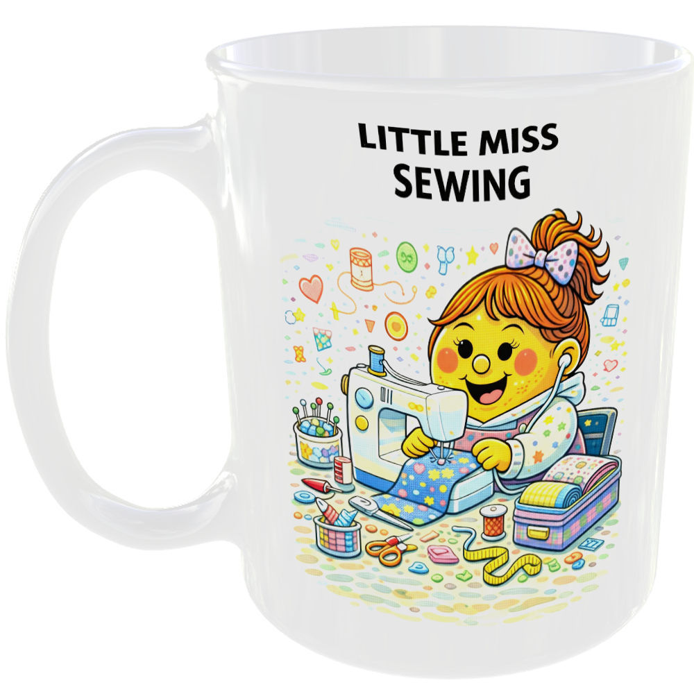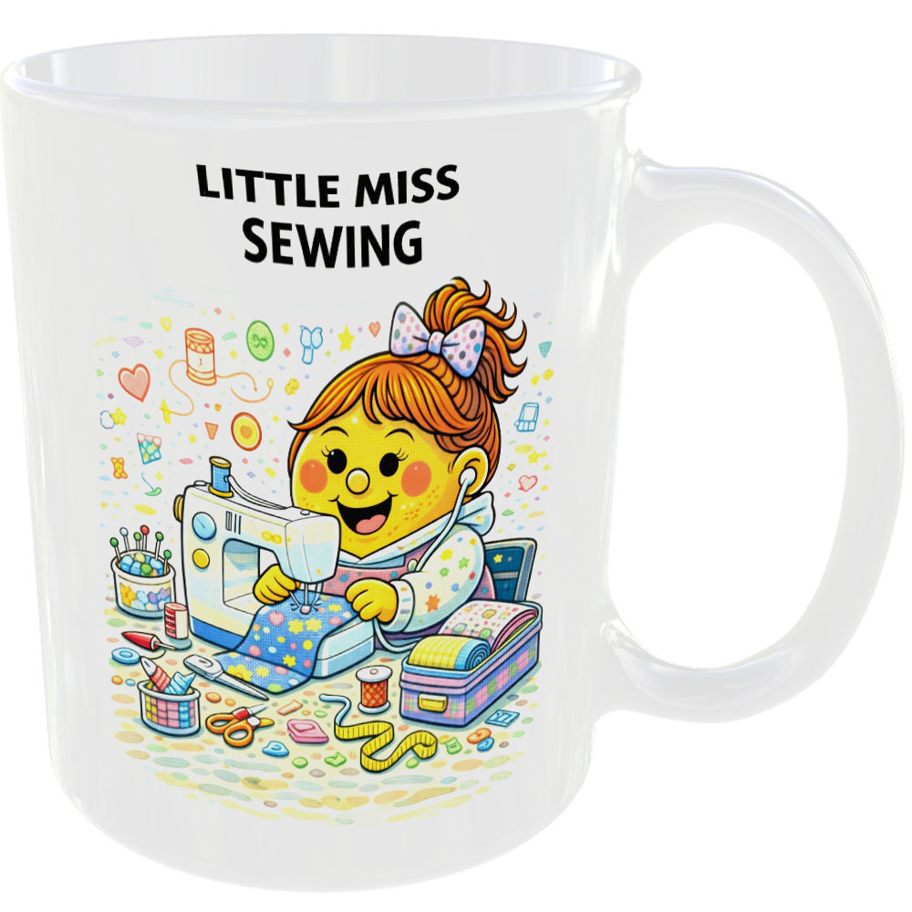Playful Little Miss design featuring ‘Little Miss Sewing’, with clean flat cartoon artwork and bold rounded text.