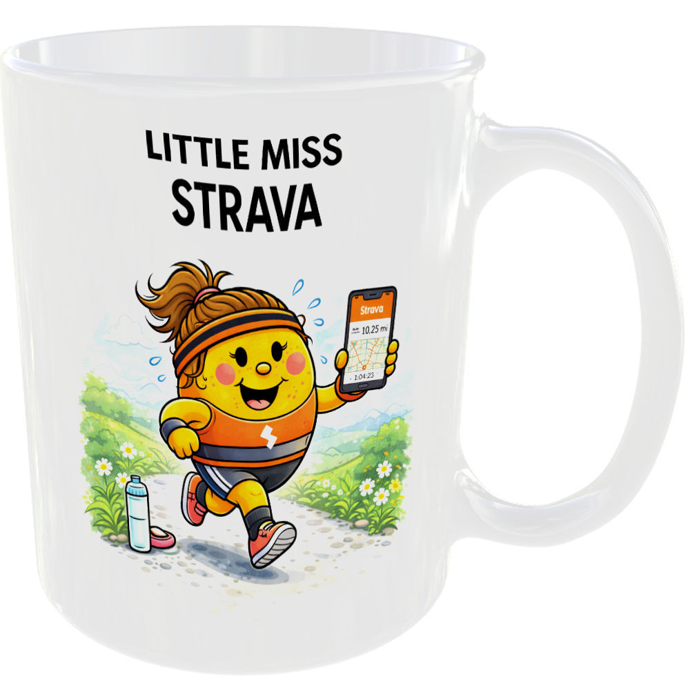 Playful Little Miss design featuring ‘Little Miss Strava’, with clean flat cartoon artwork and bold rounded text.