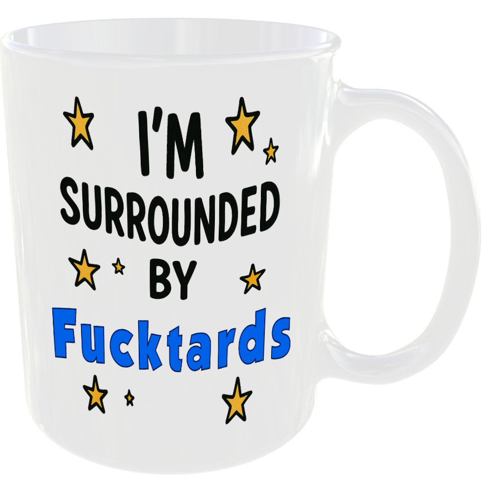 SURROUNDED BY FUCKTARDS MUG FUNNY INSULT GIFT OFFICE WORK HOME COFFEE FRIEND CUP